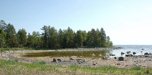strandkanten av viken kan skönjas rester av hamnens kaj. Här finns även