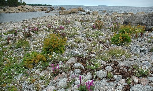 en liten artrik strandäng med bl.a. vresros, skogsviol och kustarun. Ute