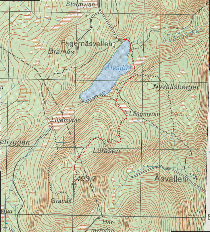 Från Fagernäsvallen vid stranden av Älvsjön går en ca 3 km lång markerad stig